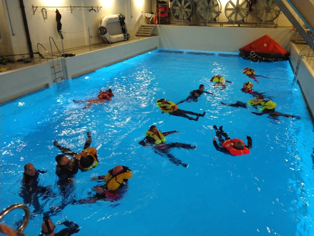 Spektakulär und anspruchsvoll war dabei das Wassertraining im Wellenbad, bei dem die Teilnehmer mit voller Segelmontur und ausgelöster Rettungsweste ca. 2 Stunden den Ernstfall erprobten – Einstieg in die Rettungsinsel und Bergung aus der Luft inklusive.