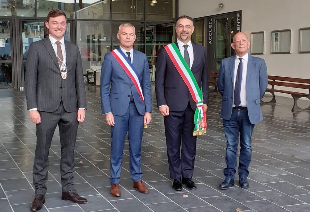 V.l.: BM Peter Horstmann, Christophe Bouillon, BM von Barentin, Enrico Volpi, BM von Castiglione delle Stivere (ital. Partnerstadt von Barentin) und Michel Bentot, ehemaliger BM von Barentin und jetzt Sonderbeauftragter für die Städtepartnerschaften Barentins