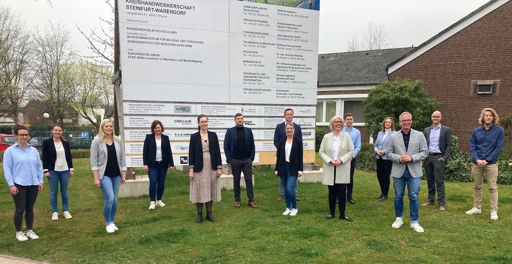 Die kommunalen Wirtschaftsförderer im Kreis Warendorf hatte gfw-Geschäftsführerin Petra Michalczak-Hülsmann (halbrechts im hellen Mantel) in die Kreishandwerkerschaft in Beckum eingeladen. Dort begrüßte Hauptgeschäftsführer Frank Tischner (3.v.r.) die Gäste, Johannes Meyer (ganz rechts) berichtete zum Thema Wasserstoff.