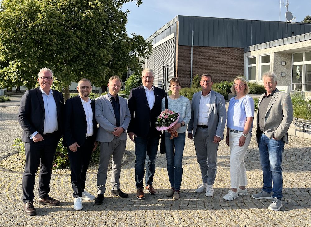 v.l. KH-Hauptgeschäftsführer Frank Tischner, ZVDH-Vizepräsident Dirk Sindermann, Obermeister Adrian Hersing, Ehrenobermeister Thomas Scheiwe mit Ehefrau Heike Scheiwe, Fritz-Marius Sybrecht (Hauptgeschäftsführer des Landesinnungsverbands des Dachdeckerhandwerks Westfalen), Ann-Kristin Erdmann (Bereichsleiterin Innungen KH Steinfurt Warendorf), stv. Obermeister Hans-Edgar Behrens