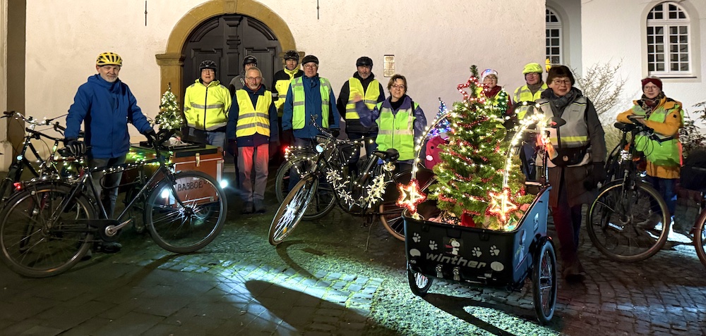 Der Runde Tisch Radverkehr hat auch im Dezember zur Critical Mass aufgerufen um mit der Radtour durch die Stadt auf die Notwendigkeit der Verbesserung des Radverkehrs hinzuweisen. Trotz Kälte und Dunkelheit trafen sich am Freitag um 17 Uhr zahlreiche interessierte Radlerinnen und Radler mit wunderbar geschmückten Rädern zur Runde durch Warendorf. Weil die Tour frühzeitig als Versammlung angemeldet wurde konnten die Fahrräder mit Lichterketten, Weihnachtsbäumchen und anderem Glitzerwerk bestückt werden. Sie erregten damit auch einiges Aufsehen bei den Menschen entlang der Strecke. Alle hatten ihre Freude bei der Fahrt durch die Stadt. Die begleitende Polizei sicherte die Tour hervorragend ab.