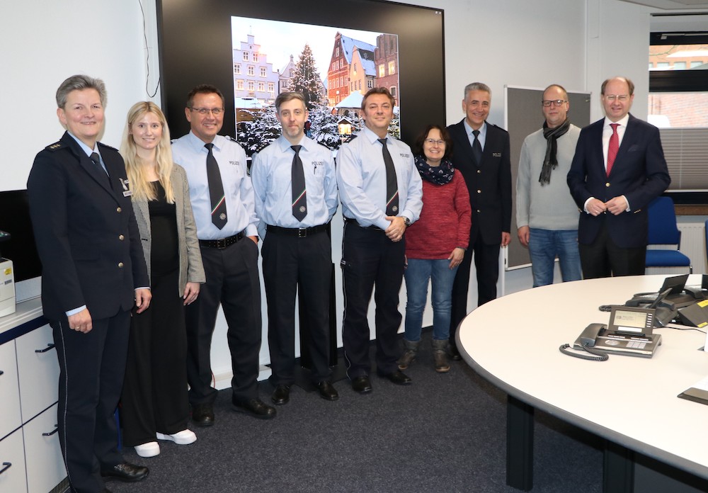 v.l.: Andrea Mersch-Schneider (Abteilungsleiterin der Polizei), Hannah Ehrentreich, Karl Muckermann, Rouven Hölscher-Gosebrink, Mehmet Gökdemir, Nicole Pellemeyer, Martin Entrup (Personalratsvorsitzender der Polizei), Frank Isenberg und Landrat Dr. Olaf Gericke.