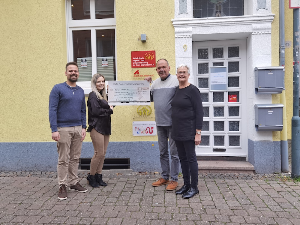 Auf dem Bild v.l.n.r.: Titus Holze, Kateryna Kyrychenko von der Fachstelle für Suchtvorbeugung und Projektleiterin von Fitkids, Erhard und Christiane Holze