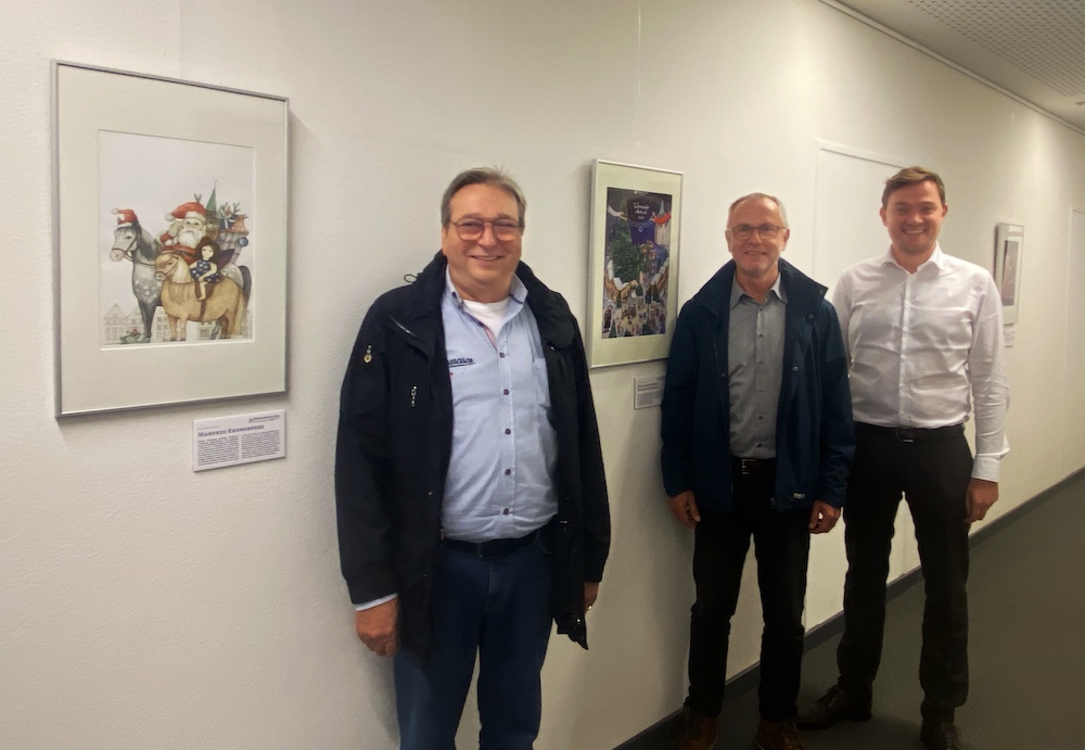 v.l.: Klaus Ende, Bernhard Austermann (beide Bürgerstiftung Warendorf) und Bürgermeister Peter Horstmann freuen sich über die Ausstellung im 1. OG der Stadtverwaltung (Lange Kesselstr. 4-6). (Foto: Stadt Warendorf)
