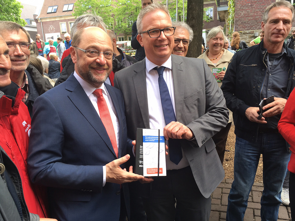 KH-Hauptgeschäftsführer Frank Tischner nutzte die Gelegenheit und überreichte das Kommunikationspaket an SPD-Kanzlerkandidat Martin Schulz.