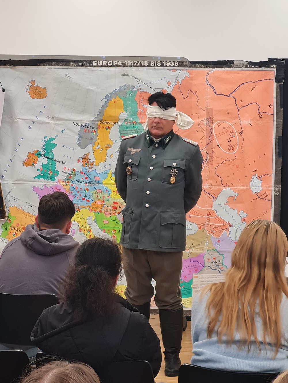 Den Auftakt machte ein Gastspiel der Kulturschule Leipzig. Die Ensembles der Einrichtung sind bundesweit unterwegs, um in Schulen zu spielen. Mit dem Stück „Stauffenberg“ beleuchtete das Theater die historische Person Claus Schenk Graf von Stauffenberg und das gescheiterte Attentat gegen Adolf Hitler am 20. Juli 1944. Günther Frese (verantwortlich für Organisation und Schauspiel) ließ die Schülerinnen und Schüler mit seiner Darstellung der Figur in eindrucksvoller Weise an dessen Gedankenwelt, Handlungen und Schicksal teilhaben. In den Spielszenen übermittelte er Motive und Gewissensdilemmata von Stauffenbergs in dessen widerstreitenden Rollen als hochrangigem Offizier der deutschen Wehrmacht einerseits und zentralem Mitglied einer bedeutenden Widerstandsgruppe gegen den Nationalsozialismus andrerseits. Daniela Frese (Regie und Schauspiel) erklärte in ihrer Rolle als Moderatorin den geschichtlichen Kontext zum besseren Verständnis des Stücks. Eingespielte historische Original-Audioaufnahmen, z.B. von Soldatenvereidigungen und Ansprachen Adolf Hitlers, verliehen der Inszenierung einen besonderen Nachdruck. Nach der Aufführung erläuterte Daniela Frese weitere Hintergründe, etwa die nachfolgende Rezeption des Attentats in der Bundesrepublik, und spannte den Bogen hin zum heutigen politisch-gesellschaftlichen Diskurs über Demokratie, Meinungsfreiheit und Respekt. Als Ergänzung zur Thematik des Theaterstückes konnten Schülerinnen und Schüler mit VR-Brillen, vom Medienzentrum des Kreises Warendorf zur Verfügung gestellt, einen 3D-Rundgang durch das Anne-Frank-Haus in Amsterdam machen.