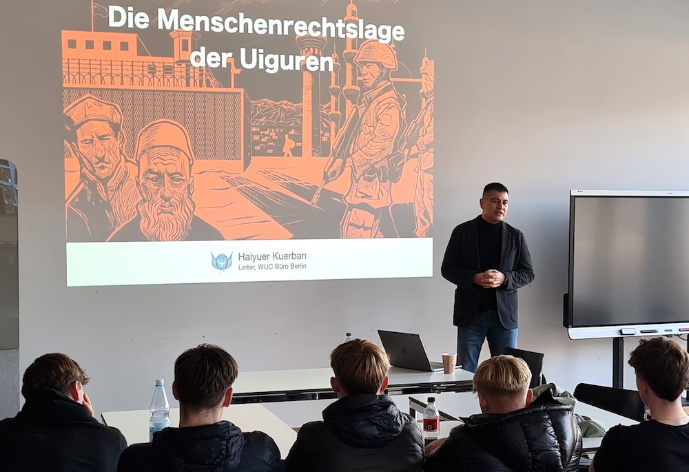 Die Unterdrückung von Freiheit und Menschenrechten in der Gegenwart stand im Fokus eines Vortrages von Haiyuer Kurban. Der Referent gehört der Volksgruppe der Uiguren an. Er verließ vor 20 Jahren seine Heimatregion Ost-Turkestan (China), um zum Studium nach Deutschland zu gehen. „Hier habe ich eine ganz andere Welt kennengelernt“, so Kurban, „denn in Deutschland darf man die Regierung kritisieren.“ Aufgewachsen und erzogen in einem autokratischen System habe er gelernt, sowohl im privaten wie im öffentlichen Rahmen sehr genau darauf zu achten, was man sagt. Nach langen Jahren ehrenamtlichen Engagements ist Haiyuer Kurban inzwischen hauptamtlicher Büroleiter der Organisation Weltkongress der Uiguren e.V., die sich für die Interessen der Uiguren einsetzt. Er gewann die Aufmerksamkeit der Schülerinnen und Schüler mit vielen Details zu seiner persönlichen Lebensgeschichte „mit furchterregendenen Erfahrungen“ und zur Situation der Uiguren. Kurban berichtete von chinesischen Internierungslagern, in denen Uiguren zur Umerziehung und Zwangsarbeit gefangen gehalten würden. Die Produktion von billigen Konsumgütern aus China müsse auch in Verbindung mit diesen Internierungslagern gesehen werden.