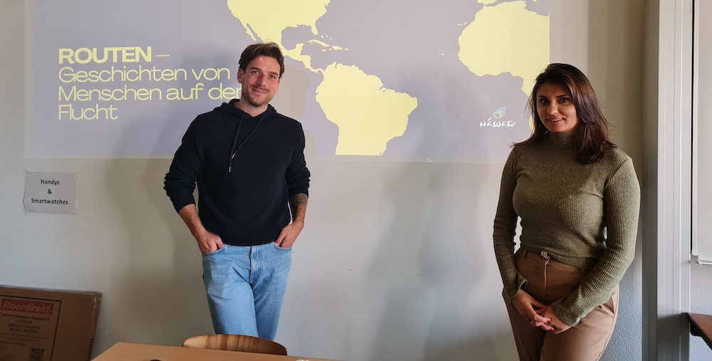 Zum Thema „Flucht“ nahmen Schülerinnen und Schüler an einem Workshop der Organisation HÁWAR teil. Projektmanager Filipo Steven Ferrara begleitete sie dabei, sich mithilfe multi-medialer Infomaterialien Ursachen, Hintergründe, Routen und globale Verflechtungen von Fluchtmigration zu erschließen und die Ergebnisse auszuwerten. Dabei ging es um die Situation von Menschen aus Syrien, Afghanistan, Venezuela und dem Irak. Eine intensive Gesprächsrunde mit der in Afghanistan geborenen Trina Mansoor beschloss den Workshop. Sie erzählte von ihrer eigenen bedrückenden Fluchtgeschichte als kleines Mädchen über Pakistan und die Niederlande bis zu ihrem heutigen Leben in Deutschland. Glaubhaft und berührend vermittelte sie ihr besonderes Engagement für die Situation der Frauen in Afghanistan, die unter der Herrschaft der Taliban mehr und mehr entrechtet würden. Zum Schluss lautete ihr Appell an die Schülerinnen und Schüler zu der Frage, was Jugendliche gegen Fremdenfeindlichkeit tun könnten: „Redet miteinander! Bewahrt Vorsicht vor falschen Inhalten im Internet! Und bitte unbedingt lesen, um sich zu informieren und kritisches Denken zu entwickeln.“ Eine Teilnehmerin des Workshops formulierte ihr Fazit so: „Es ist wichtig, auf die Situation der Menschen in ihren Herkunftsländern zu schauen, bevor man urteilt.“