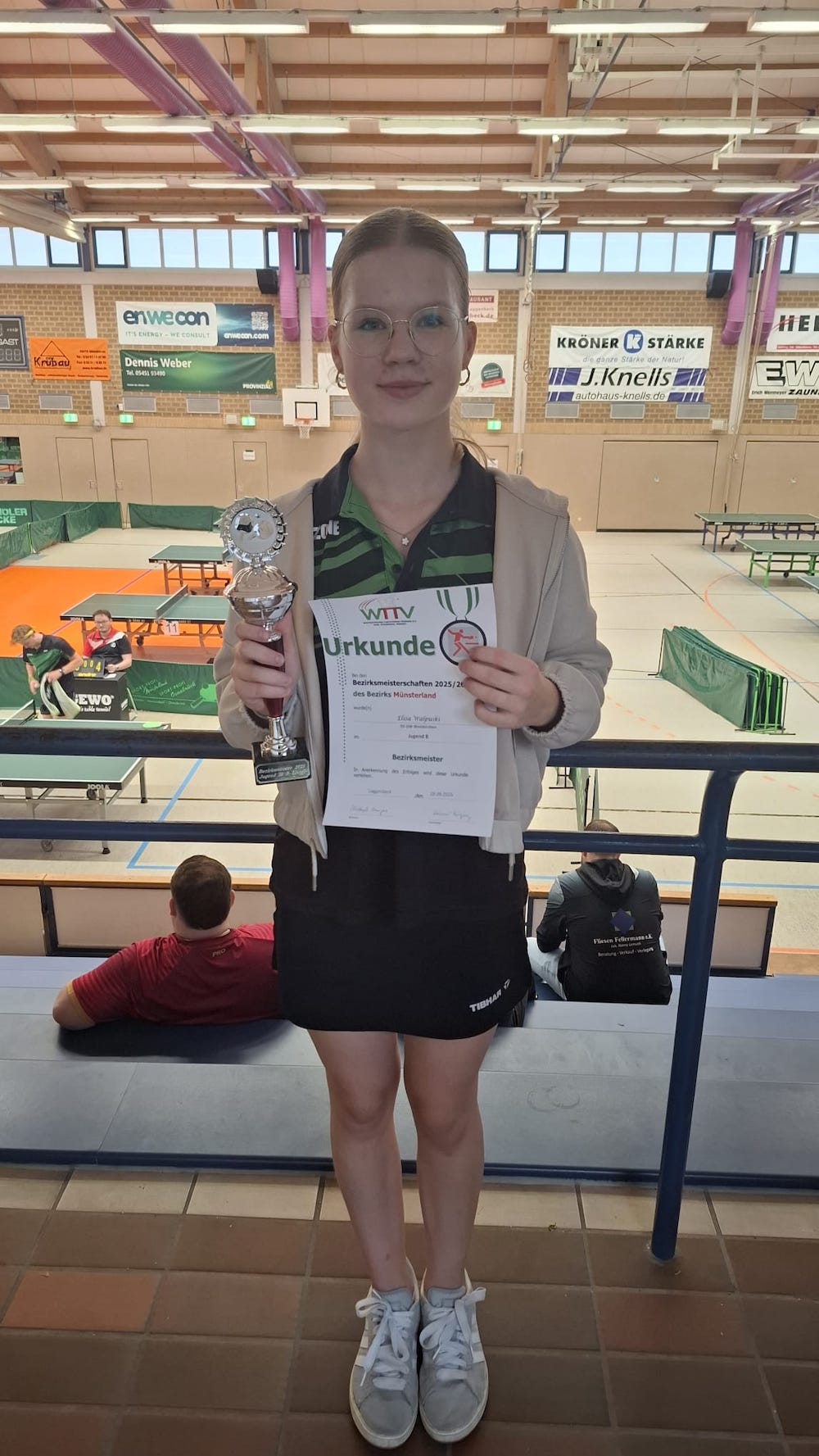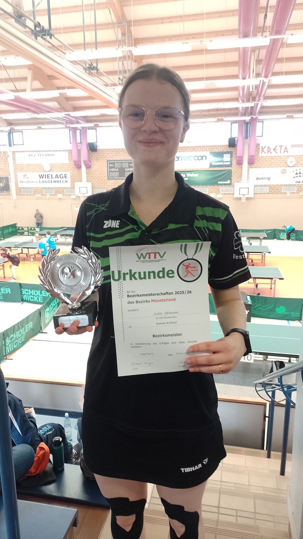 Auch in der Mädchen 19 Klasse wussten die Grün Weißen zu überzeugen. Hier spielte Lia Himler ein tolles Turnier. Nachdem Sie in der Gruppenphase die Topfavoritin Diana Shevnin aus Burgsteinfurt bereits in den Entscheidungssatz zwang und dort nur hauchdünn verloren hat, trafen die beiden Mädchen im Finale erneut aufeinander. Auch hier war die Burgsteinfurterin nur einen Tick stärker, sodass Lia Himler den zweiten Platz belegte. Damit verbunden ist auch ein Ticket für die westdeutschen Meisterschaften der Mädchen 19 im Dezember in Viersen. An der Seite ihrer Mannschaftskollegin Elisa Walpuski kletterte Lia Himler sogar noch eine Stufe höher auf dem Siegerpodest. Die beiden Westkirchenerinnen konnten das favorisierte Doppel aus Burgsteinfurt in der Mädchen 19 in einem spannenden Finale bezwingen. Die beiden Brüder Jan und Mats Hidding waren in der Jungen 13 Klasse sehr erfolgreich. Im Halbfinale kam es zum direkten Duell der beiden. Hier konnte sich Jan Hidding gegen seinen erst neun Jahre alten Bruder Mats durchsetzen. Im Finale unterlag er Theo Kuhn aus Ladbergen. In der Doppelkonkurrenz spielten die Gebrüder Hidding ebenfalls gut mit. Auch gegen ihren Vereinskollegen Bela Hoppe, der gemeinsam mit Leo Vietmeier aus Ladbergen ein gutes Doppel bildete, konnten sie sich dabei im Viertelfinale durchsetzen. Erst im Finale wurden die Hiddings von einem Team aus Ladbergen bezwungen. Bis in den späten Abend hinein durften sich noch die Erwachsenen in der Herren C Klasse (bis 1500 TTR Punkte) messen. Auch hier ging der Titel nach Westkirchen. Jonas Schwarz sicherte sich hier nach 2023 zum zweiten Mal den Titel. Zum ersten Mal dabei waren Tia Deitermann und Emily Lindner. Beide GW Nachwuchsspielerinnen wurden in der Mädchen 11 Klasse eingesetzt. Hier belegte Tia Deitermann vor Emily Lindner den 2. Platz. Mats Hidding startete in der Jungen 11 Klasse als Topfavorit.  Im Finale kam es dann zum erwarteten Duell mit Ruben Stankovic von der Warendorfer SU, dass Mats trotz einiger Mühe für sich entscheiden konnte. Im Doppel belegten die beiden im Anschluss gemeinsam den ersten Platz. Am Sonntagnachmittag standen dann noch zwei weitere GW Akteurinnen   ganz  oben auf dem  Treppchen. Lotte Aßmann, die sich in der Damen A Konkurrenz durchsetzen konnte. Zum ersten Mal überhaupt ist Westkirchen damit bei den westdeutschen Meisterschaften der Damen vertreten. Diese finden im Januar in Waltrop statt. Den Schlusspunkt auf ein sehr erfolgreiches GW Wochenende setzte Elisa Walpuski. Nach einem unglücklichen Turnierstart in der Mädchen 19 Klasse am Samstag, zeigte sie am Sonntag in der Jungen B Klasse (bis 1200 TTR Punkte) ihr Können und holte sich ungefährdet den Turniersieg.