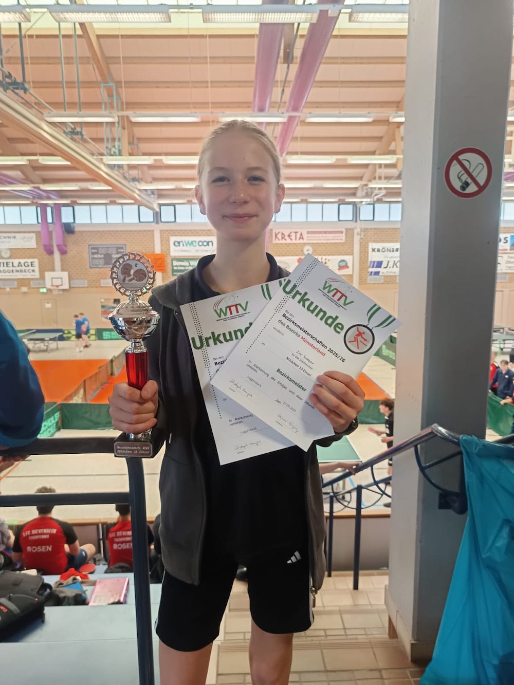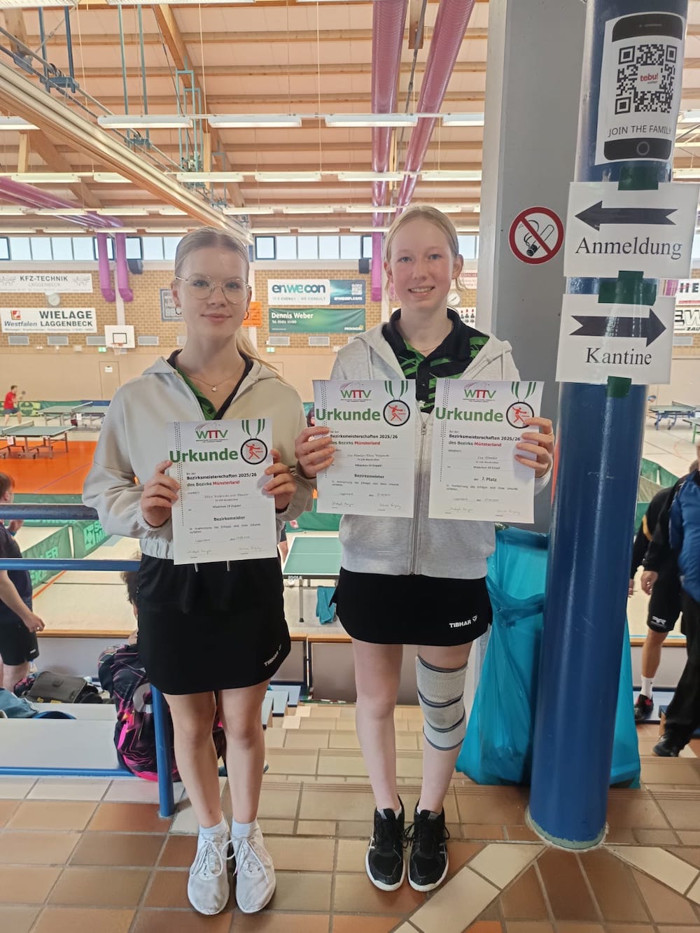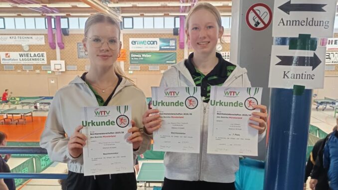 Westkirchen (B.S.) Bei den diesjährigen Tischtennis Bezirksmeisterschaften, die beim Cheruskia Laggenbeck ausgetragen wurden, waren die Westkirchener Akteure zahlreich vertreten. Ein erstes Ausrufezeichen setzte bei diesem Turnier Zoé Semar. Die junge Westkirchenerin blieb in der Mädchen U13 Klasse ungeschlagen und sicherte sich den Titel. Im Doppel, an der Seite von Mila Boulos (Concordia Albachten), gelang ihr ebenfalls der Sprung auf den ersten Platz.