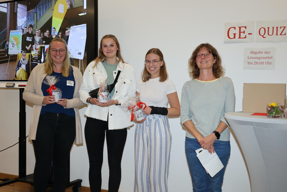 Sarah Büning, Elisa Hinse und Christina Groll (v.l.n.r.) konnten alle Quizfragen richtig beantworten und bekamen von Ulrike Eselgrim eine mit Süßigkeiten gefüllte Paul-Spiegel-Berufskolleg-Tasse überreicht.