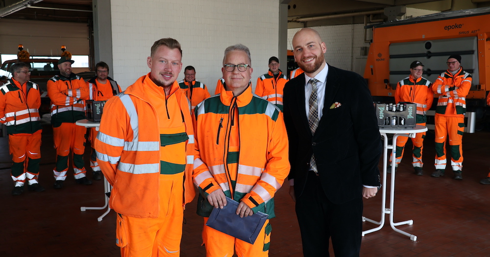 Verkehrsdezernent Michael Ottmann (r.) überreichte Christian Wölk (Bauhof Beckum) und Ulrich Redbrake (Bauhof Warendorf) einen Gutschein für Grillgut zum Dank für ihre Winterdiensteinsätze in den letzten Wochen. – Foto: Kreis Warendorf