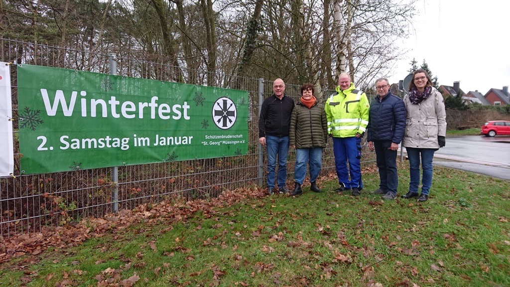 Müssingen. Nicht zu übersehen ist das neu gestaltete Banner, das Mitglieder des Vorstands der Schützenbruderschaft „St. Georg“ Müssingen um Brudermeisterin Monika Schlieper nun an den Ortseingang Müssingen an der B64 angebracht haben. Es verkündet das Winterfest, das auch im Jahr 2025 wieder am zweiten Samstag im Januar stattfindet. Die Schützen freuen sich bereits jetzt, am 11.01.2025 ab 20.00 Uhr viele Gäste in den „Alten Hallen Daweke“ am Birkenweg zu begrüßen. DJ Kerni sorgt dann für die passende Musik zum Tanzen, gegen den kleinen Hunger gibt es einen Imbisswagen von Robert Schräder und das Thekenteam von Festwirt Jens Strotmann hilft, den Durst zu stillen.
