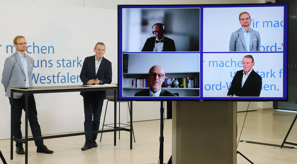 Wann kommt der ersehnte Aufschwung? Diese Frage diskutierten beim IHK-Konjunkturforum Prof. Manuel Rupprecht (l.) und Dr. Fritz Jaeckel sowie zugeschaltet Prof. Michael Grömling (Monitor unten links) und Patrick Welter.