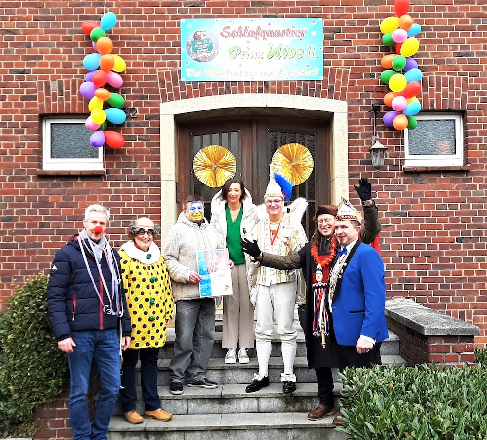 Bereits vor einigen Tagen hatten die direkten Nachbarn des Prinzen über seinem Hauseingang das Banner „Schlafquartier Prinz Uwe II.“, angebracht. Prinz Uwe freute sich natürlich riesig über die weitere „Anteilnahme“ und hängte die Gratulationsurkunde als jecke Idee gleich mit zum Banner an die Hauswand.