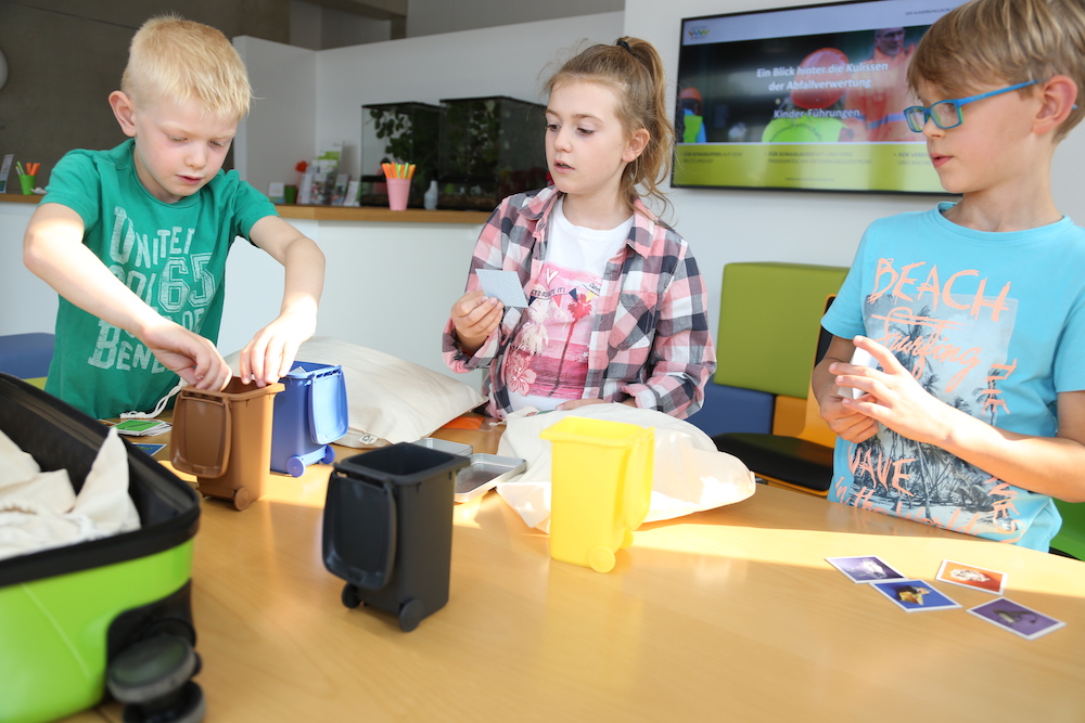 Die Kinder arbeiten mit Material aus dem Schulkoffer von AWG und GEG, der kostenlos ausgeliehen werden kann: Was gehört denn wohl in welche Tonne?