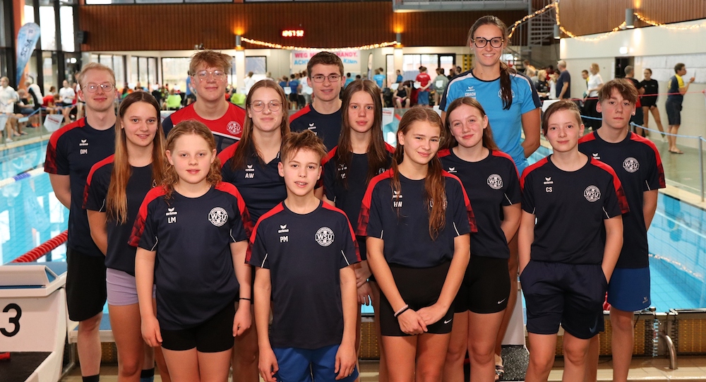 Theresa Bellmann (Jg. 2011) konnte in Stukenbrock besonders über die Sprintstrecken überzeugen. Nachdem sie am Samstag bereits Silber und Gold über die 50m Freistil und Schmetterling holte, belegte sie über die 50m Rücken nicht nur Platz Eins in ihrem Jahrgang, sondern schwamm auch ins offene Finale am Nachmittag. Dort konnte sie sich erneut steigern und in sehr schnellen 32,33 Sekunden Platz Zwei in der jahrgangsübergreifenden Wertung erzielen. Ebenfalls in die Finals einziehen konnte Paul Weißen (Jg. 2010) über die 50m Rücken und Freistil und jeweils Silber gewinnen. Über die 50m Freistil wuchs er wahrlich über sich hinaus und erreichte das Ziel in 23,88 Sekunden. Diesen neuen Vereinsrekord ließ er allerdings nicht alleine stehen, sondern ergänzte noch die 100m Rücken (59,37 Sekunden), 100m Schmetterling (57,72 Sekunden) und 200m Lagen (2:12,82 Sekunden). Auch Schwester Anna Weißen (Jg. 2006) konnte nach einer harten Saison sehr gut abliefern. Mit fünf Podestplatzierungen, zwei Finalteilnahmen und einigen Bestzeiten ließ sich das Wochenende durchaus sehen. Das 50m Brust Finale bestritt zudem David Maßmann (Jg. 2004), welches er mit einem souveränen Rennen in 28,86 Sekunden für sich entscheiden konnte.