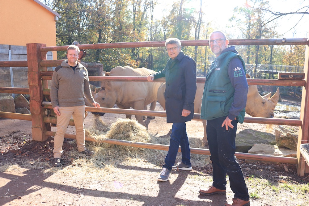 Drücken die Daumen für den Nashornnachwuchs von Kuh Amalie (hinten links): Tobias Klumpe (Zoologische Leitung), Dr. E.h. Fritz Brickwedde (Präsident Zoogesellschaft Osnabrück e.V.) und Franz Schelshorn (Revierleiter Nashörner und Tierpfleger Zoo Osnabrück)