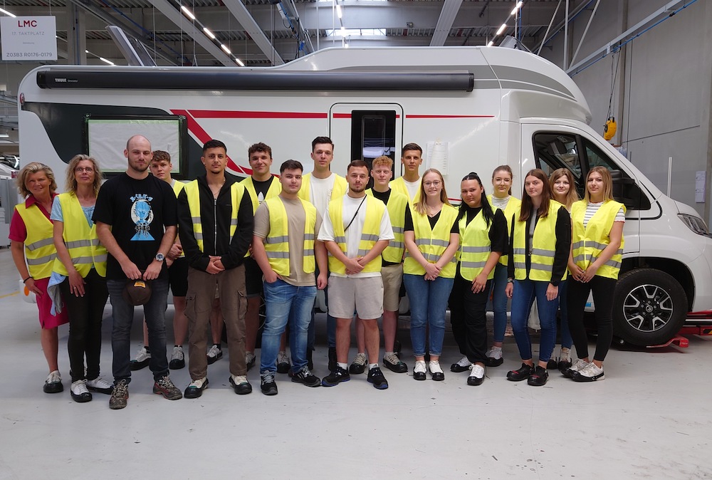 Die angehenden Industriekaufleute (mit ihren Lehrkräften Sandra Mester und Nicole Lasthaus, 1. u. 2. v. li.) lernten bei LMC die Fahrzeugproduktion vor Ort kennen. Auch der Zulieferer Surteco GmbH mit passend bedruckten Oberflächen für die Schränke und Böden beeindruckte.