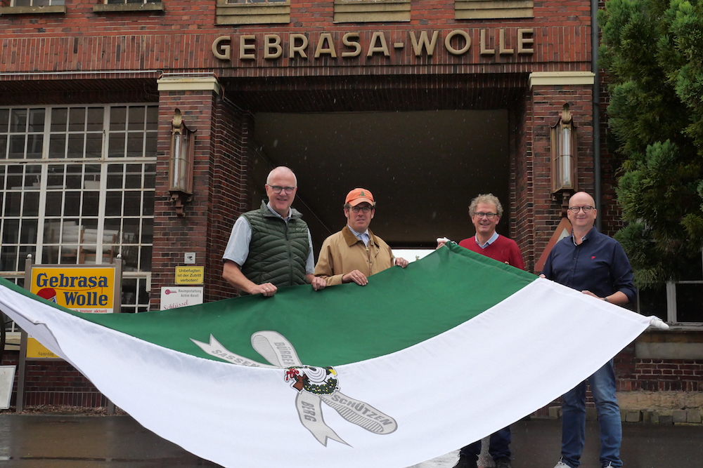 Mit neuer Fahne dort, wo alles begann: Werner Storck, Henning und Karl-Alfred Dörholt sowie Präsident Frank Deitert (v.li.)