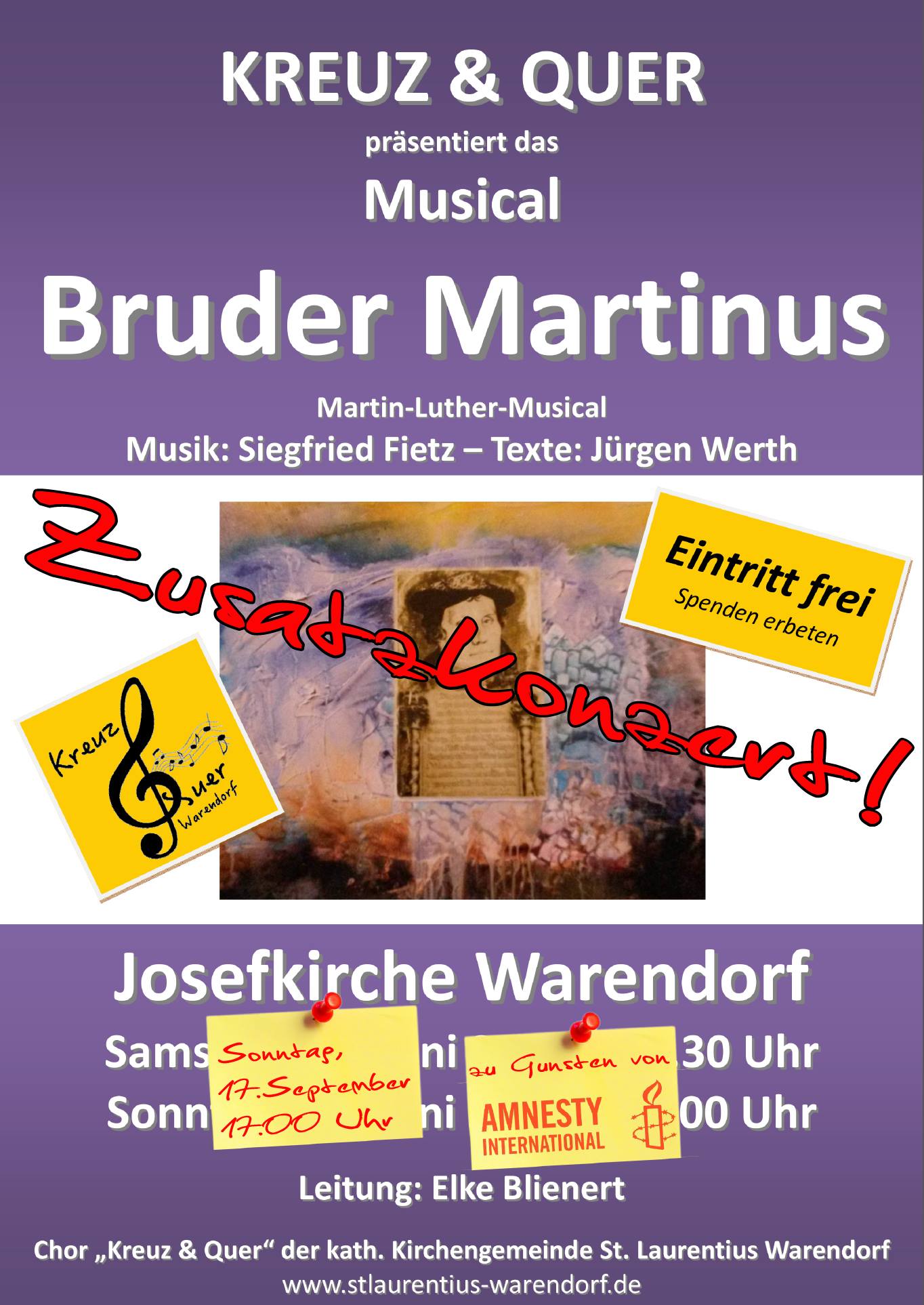 Warendorf – Für diejenigen, die das Musical noch nicht erlebt haben, gibt es eine neue Chance: Der Chor Kreuz & Quer der Laurentiusgemeinde gibt am 17. September um 17 Uhr in der Josefkirche eine zusätzliche Vorstellung seines Musicals „Bruder Martinus“, das bereits im Juni zweimal aufgeführt wurde und großen Anklang fand. Wiederum darf sich das Publikum auf eingängige schwungvolle, teils humorvolle, teils auch besinnliche Melodien und Texte in vierstimmiger Klangfülle durch die 75 Sängerinnen und Sänger freuen. In 14 Liedern und vielen kleinen Spielszenen wird das Leben Martin Luthers nachgezeichnet und für die Zuhörerinnen und Zuhörer erlebbar gemacht. Der Inhalt orientiert sich eng an der historischen schriftlichen Überlieferung. Der bekannte christliche Komponist Siegfried Fietz schuf das Musical „Bruder Martinus“ 2012, die Texte dazu schrieb Jürgen Werth.